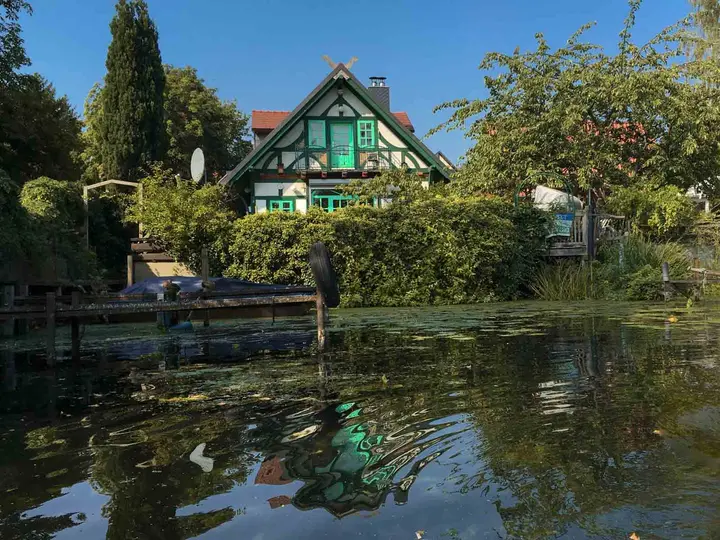 Hier, in der Nähe des Südhafens, reichen Grundstücke bis zum Wasser; der eine Anwohner verkauft seinen Honig direkt an die Wasserpassanten, der andere schlürft seinen Morgenkaffe. Einfach lässig. Mittendrin in der Stadt, und dennoch ruhig und entspannt. Kein Verkehrslärm dringt ans Ohr bis auf die Flieger zum Flughafen Tegel.