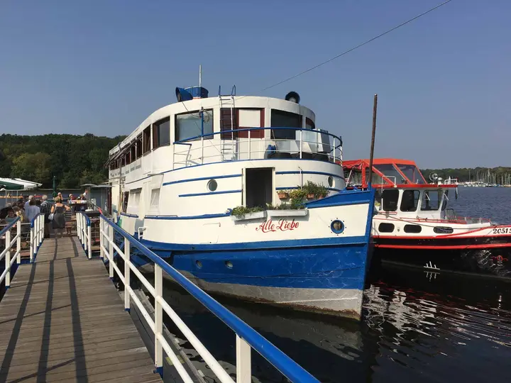 Nach rund 1,5 Stunden Paddeln schmerzen die Arme und der Magen knurrt. Zurück aus Klein-Venedig, am Ende des Stößensees liegt die Alte Liebe, ein charmantes Restaurantschiff an einer kleinen Badestelle. Mit nassem Hintern dann einen der letzten Plätze im Restaurant ergattert und mit Deftigem und Süßem die Begierden gestillt. Diese Stelle würde sich auch gut für den Paddel-Einstieg eignen, wenn man Klein-Venedig in einer kürzeren Runde erleben will.