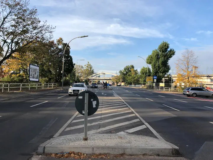 Es gibt nur wenig üble Stellen auf dem Weg; die hier ist eine davon: die viel und schnell befahrene Fennstraße muss gequert werden. Immerhin gibt es kleine Mittelinseln für Radler und Fußgänger.