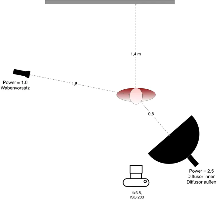 Beim ersten Setup experimentiere ich mit Power-Einstellungen von 2 (Spot) und 4 (Oktabox); nach ein paar Testfotos hab ich Blende 8 als Arbeitsblende gefunden. Das macht leider die Falten im Hintergrundstoff scharf, doch dazu später.