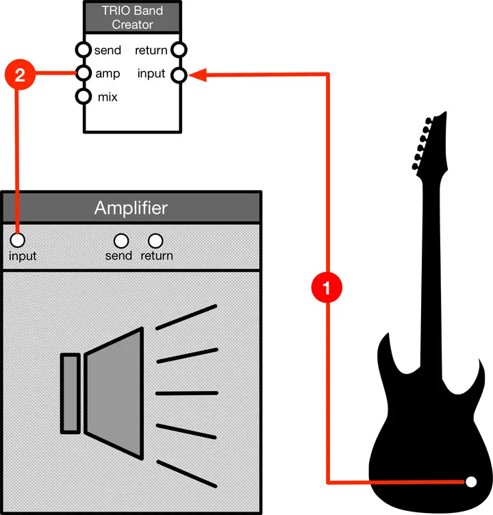 Der einfachste Weg, den Gitarrenverstärker mit dem Trio zu verkabeln ist wie im Bild angegeben:
