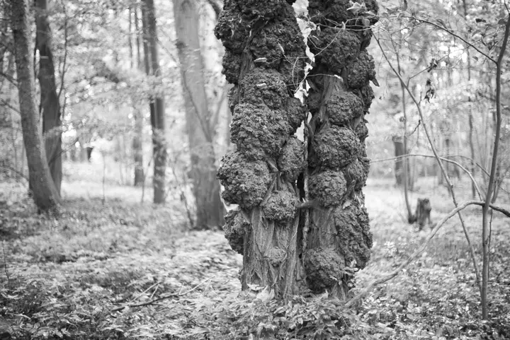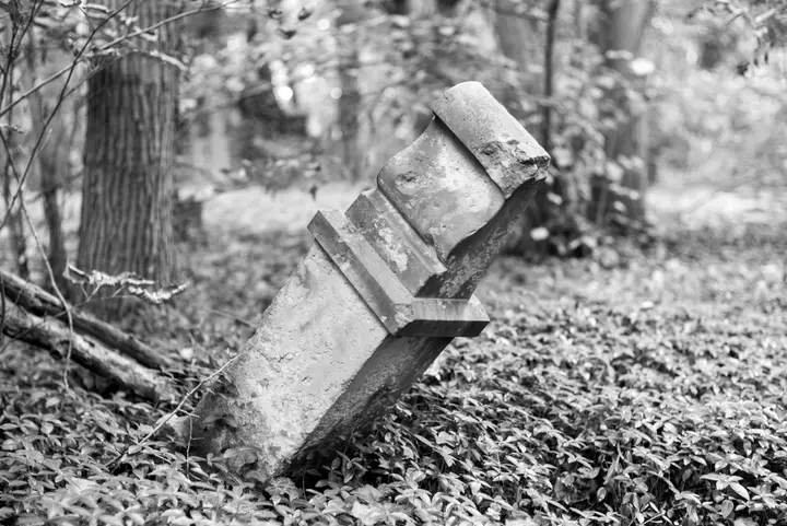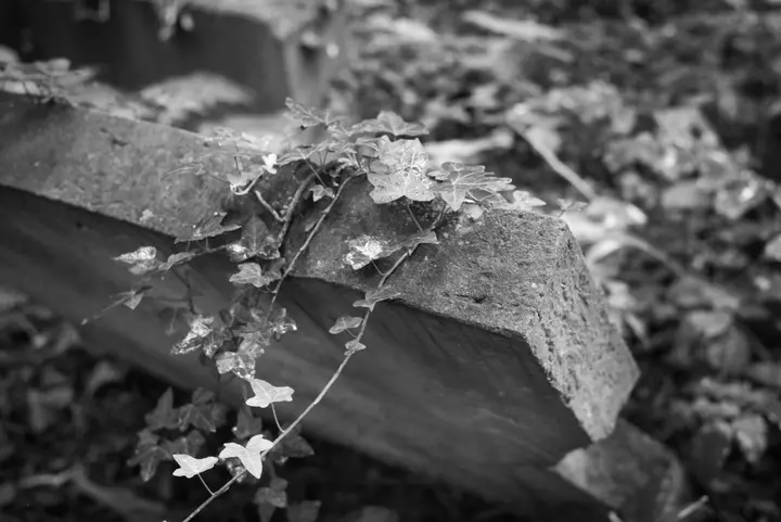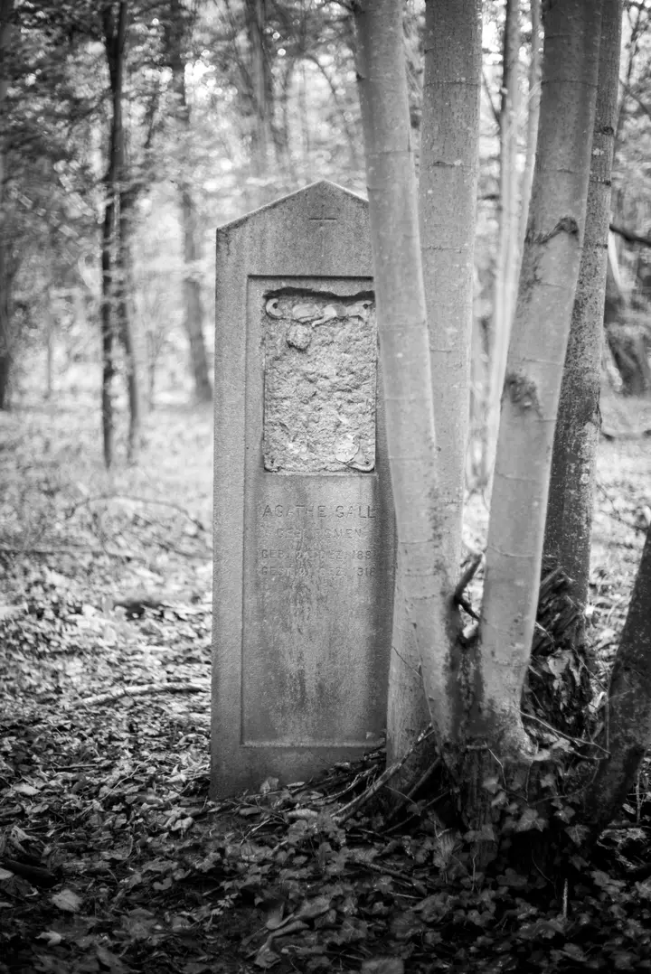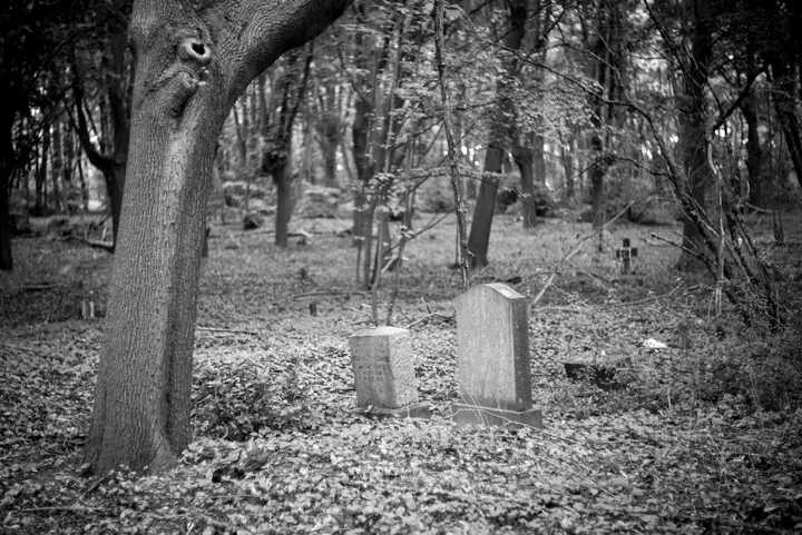 Es gibt ein paar Pfade, die durch den Wald führen, und auch die Bäume stehen in Reihen, doch abgesehen von diesen Leitlinien herrscht hier ein Urwald aus Büschen, Bäumen, Brennnesseln und Efeu, und Grabsteinen, die, von ihren Sockeln gekippt, umherliegen.